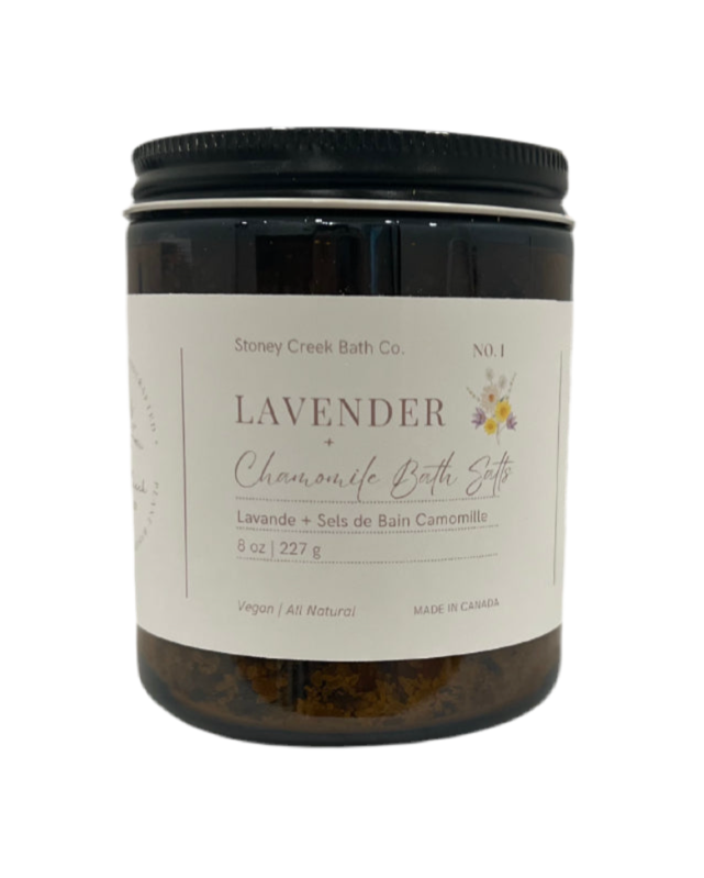 Indulge in a truly relaxing bath ritual with our Lavender + Chamomile Bath Salts, handcrafted in Stoney Creek, Ontario.